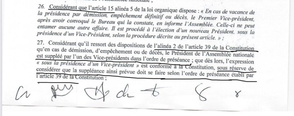 Le cœur de cette décision réside dans une clarification décisive : la vacance du Président de l’Assemblée nationale ne saurait justifier une suspension totale de l’activité parlementaire, ni laisser planer le doute sur l’identité de la personne habilitée à présider la séance élective.