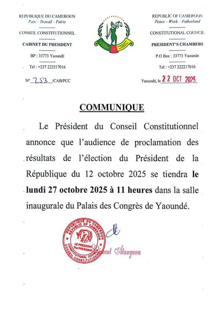 Le Conseil Constitutionnel du Cameroun a annoncé ce mardi que l’audience solennelle de proclamation des résultats de l’élection présidentielle du 12 octobre 2025 se tiendra le lundi 27 octobre à 11h, dans la salle inaugurale du Palais des Congrès de Yaoundé.