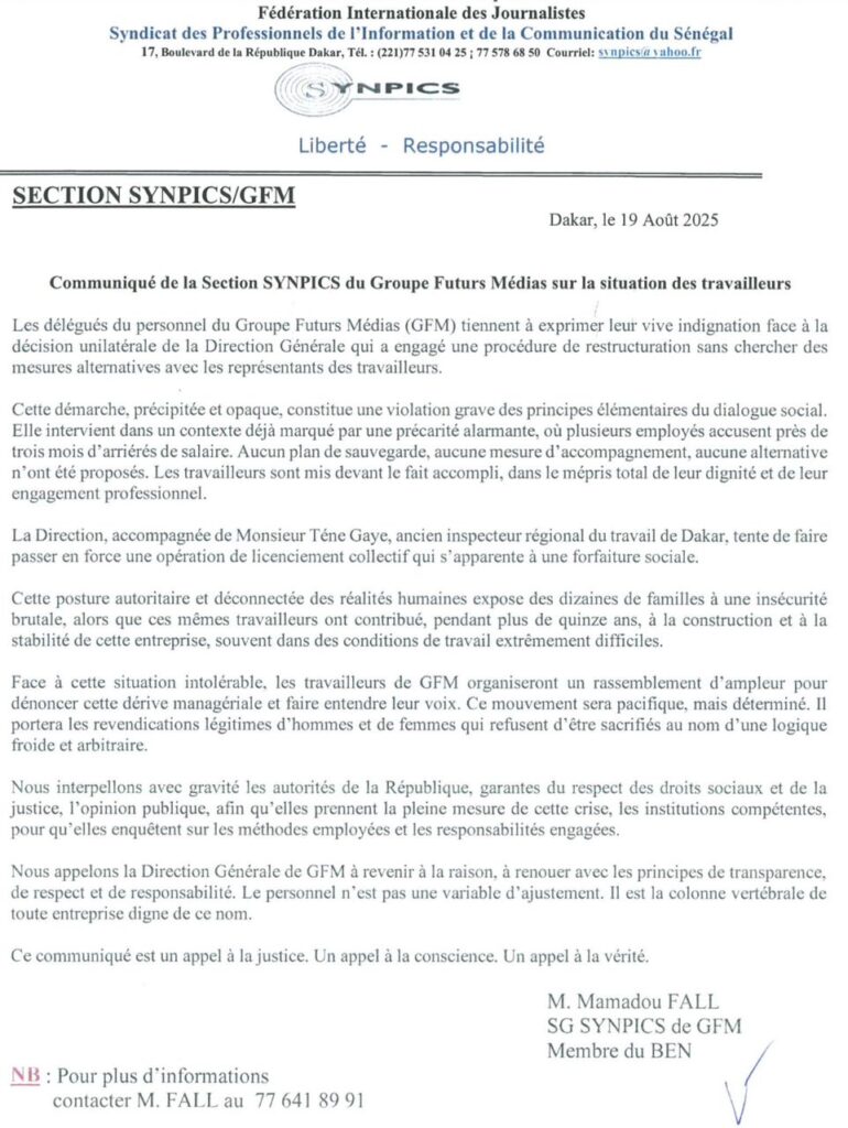 Dans un communiqué publié ce mardi 19 août, ils accusent la direction, avec la complicité présumée de l’ex-inspecteur du travail Téne Gaye, de vouloir imposer un licenciement collectif sans plan de sauvegarde ni mesures d’accompagnement. Une démarche qualifiée de « forfaiture sociale » par la section du Synpics-GFM.