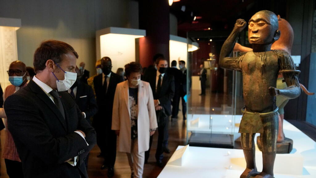 French President Emmanuel Macron looks at a 19th century royal statue of a half-man half-bird of King Ghezo, at the Quai Branly museum in Paris, France, October 27, 2021. Michel Euler/Pool via REUTERS