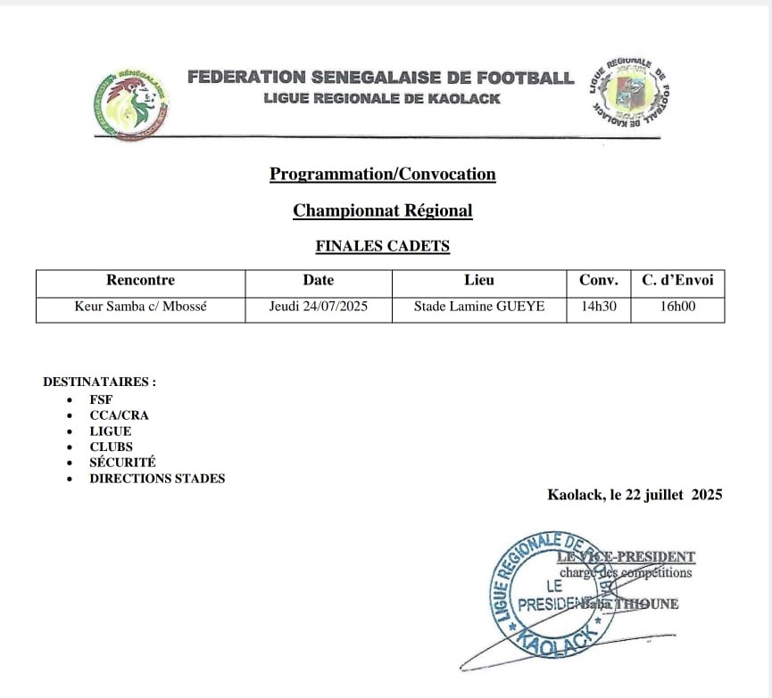 La Fédération sénégalaise de football (FSF) a officialisé la programmation de la finale du championnat régional des cadets de la Ligue régionale de Kaolack. Cette ultime rencontre mettra aux prises l’équipe de Keur Samba et celle de l’ASC Mbossé de Kaolack.