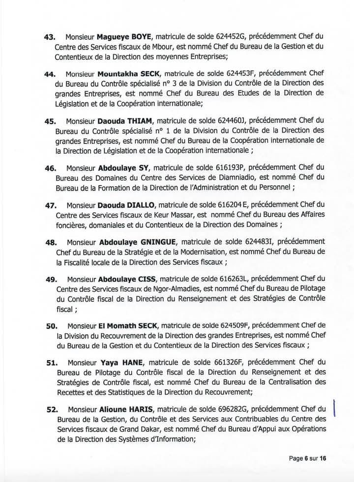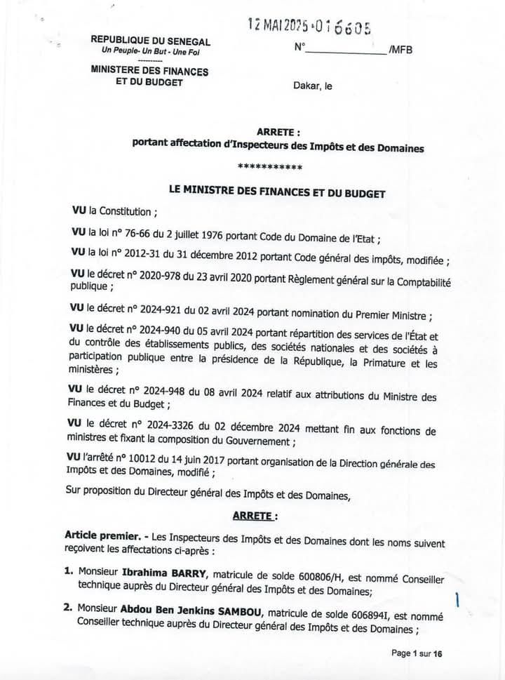 Un important réaménagement vient d’être opéré au sein du ministère des Finances et du Budget, précisément à la Direction générale des Impôts et des Domaines (DGID). Le ministre Cheikh Diba a signé, ce lundi 12 mai, un arrêté d’affectation qui marque un vaste mouvement d’inspecteurs des Impôts et des Domaines à travers le pays.