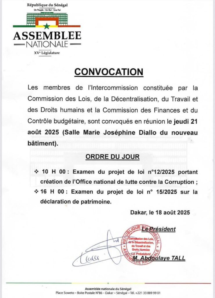 L’Intercommission réunissant la Commission des Lois, de la Décentralisation, du Travail et des Droits humains et la Commission des Finances et du Contrôle budgétaire est convoquée en réunion ce jeudi 21 août 2025 à 10h, dans la salle Marie Joséphine Diallo du nouveau bâtiment de l’Assemblée nationale.