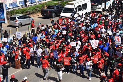 Vêtus de hauts rouges et noirs, les manifestants brandissaient des pancartes sur lesquelles on pouvait lire « Nous ne devons rien, nous ne paierons pas », « l’Afrique ne peut plus respirer » et « La réforme économique est une arnaque ».