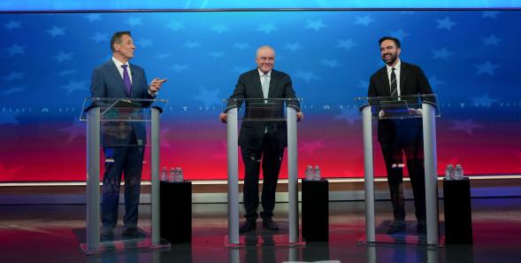 De gauche à droite, les candidats à la mairie, le candidat indépendant et ancien gouverneur de New York Andrew Cuomo, le candidat républicain Curtis Sliwa et le candidat démocrate Zohran Mamdani, lors d’un débat.