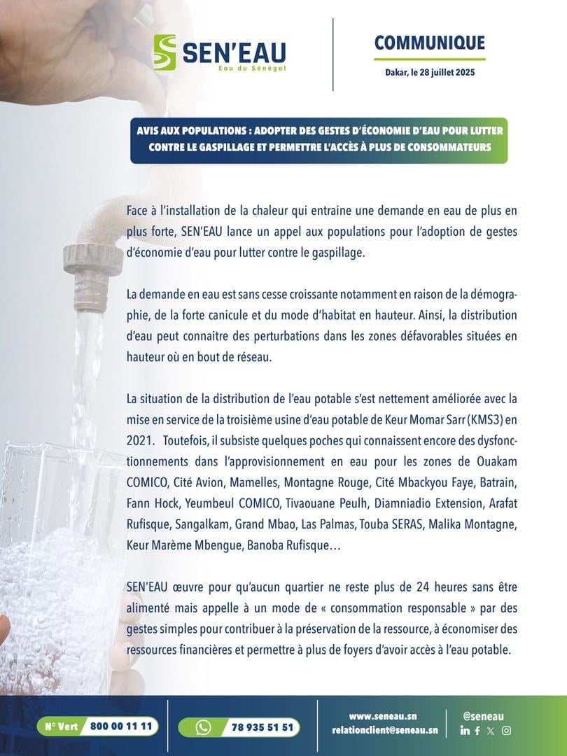 Avec la hausse des températures, l’explosion démographique et le développement de l’habitat en hauteur, la pression sur les ressources en eau potable s’intensifie. Dans ce contexte préoccupant, SEN’EAU lance un appel urgent aux populations pour adopter des gestes d’économie d’eau et lutter activement contre le gaspillage.