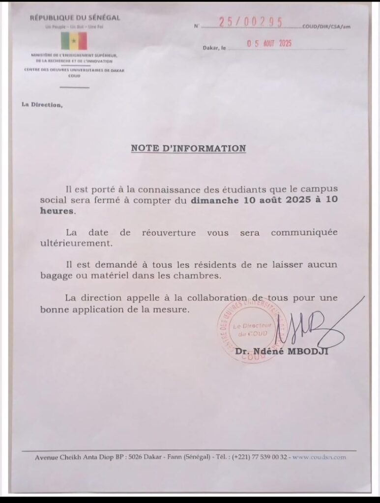 Dans un communiqué publié ce mardi, le Centre des œuvres universitaires de Dakar (COUD) a annoncé la fermeture du campus social de l’Université Cheikh Anta Diop à partir du dimanche 10 août 2025 à 10 heures.