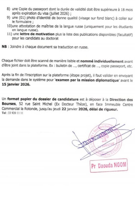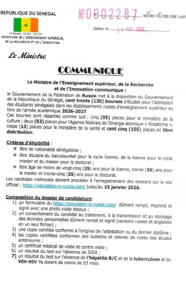 Le ministère de l’Enseignement supérieur, de la Recherche et de l’Innovation a annoncé la mise à disposition de 130 bourses d’études offertes par le gouvernement russe au profit des étudiants sénégalais pour l’année académique 2026-2027.