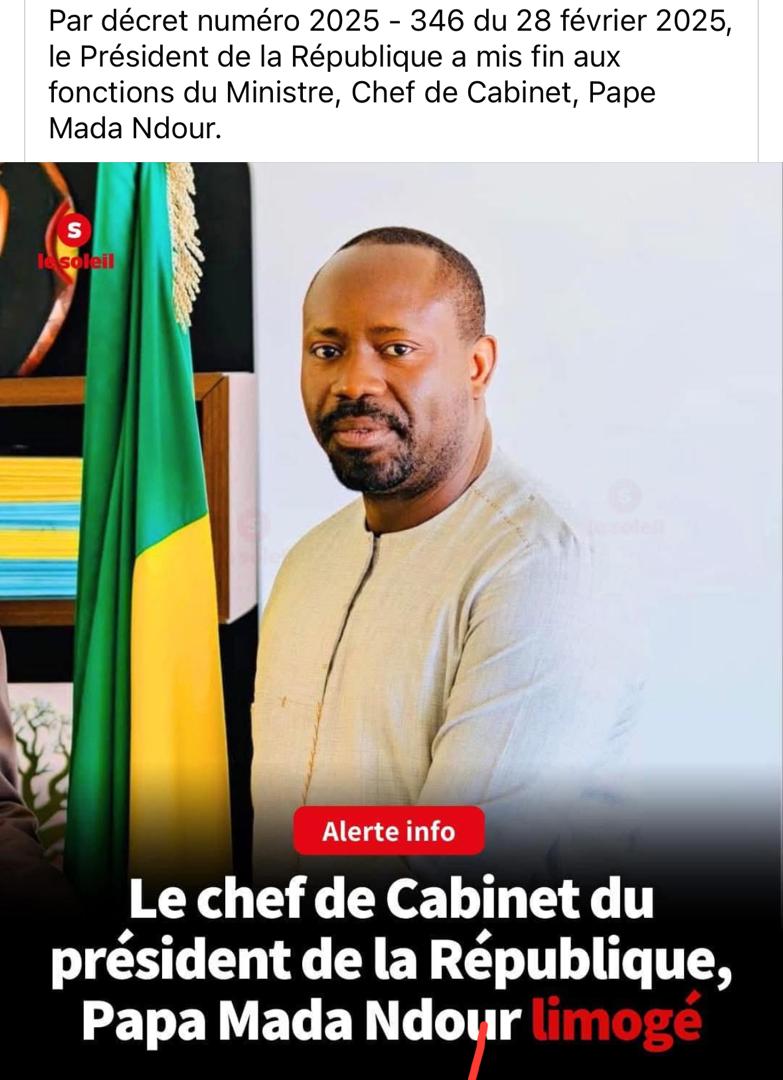 * Dans un climat politique déjà tendu par les suites de l’élection présidentielle de mars 2024, la révocation de Pape Mada Ndour par décret n°2025‑346 du 28 février 2025 dépasse le simple changement de personnel. Au-delà du limogeage, l’enjeu majeur demeure l’instauration d’un véritable pacte de confiance entre dirigeants et Citoyens diplomate de formation et nommé Chef de Cabinet du Président le 30 avril 2024 par décret n°2024‑992, Pape Mada Ndour se retrouve désormais au cœur d’une polémique qui met en lumière des pratiques de négociations opaques et des accords secrets entre figures politiques de premier plan.