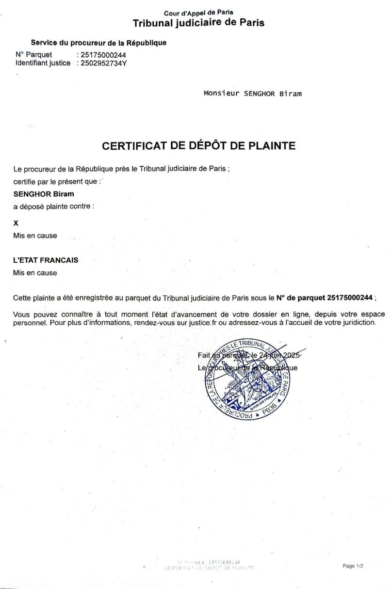 Selon une attestation émise par le parquet, le dépôt de plainte a bien été enregistré, et l’État français est nommément visé comme civilement responsable.