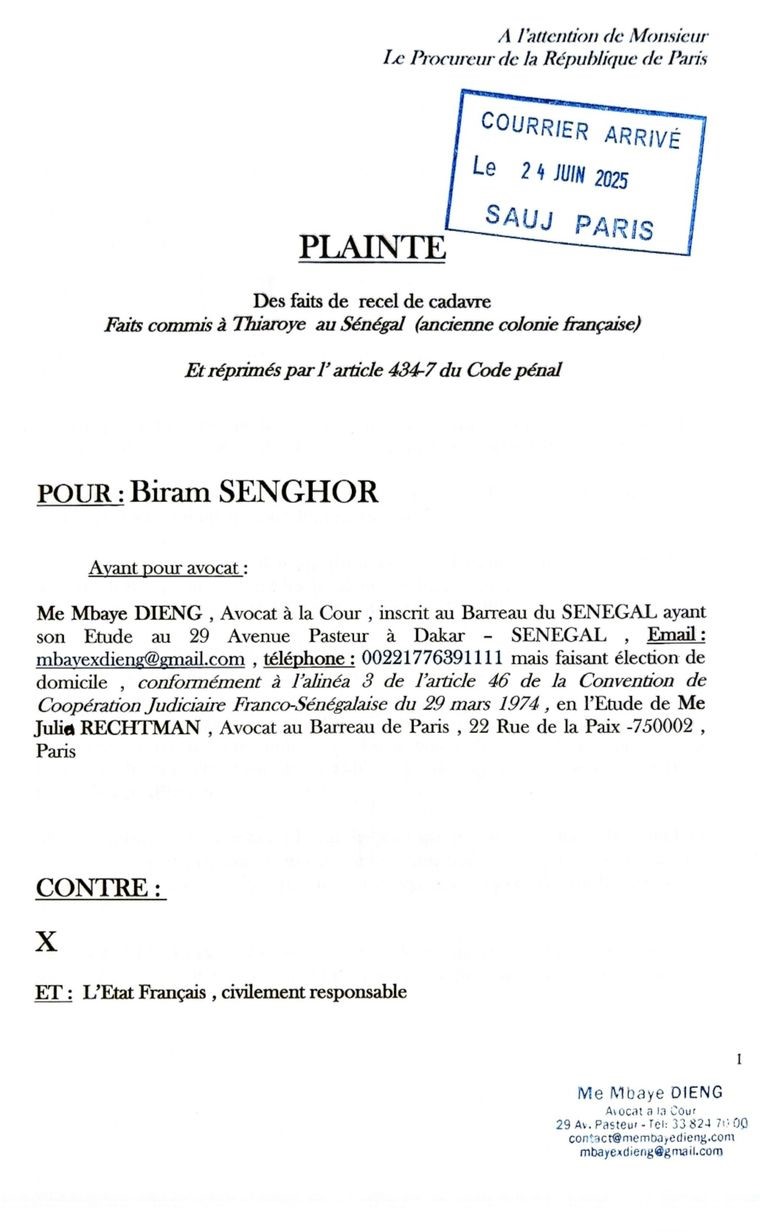 L’initiative est portée par Biram Senghor, citoyen sénégalais, fils de Mbap Senghor tombé sous les balles de l’armée coloniale française. Aujourd’hui, il vise à obtenir la reconnaissance légale de la responsabilité civile de l’État français dans la disparition et la dissimulation des corps des tirailleurs sénégalais tués par l’armée coloniale française à Thiaroye, en périphérie de Dakar.