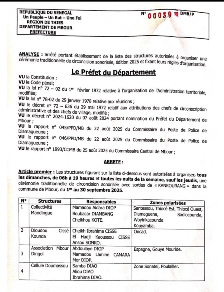 Le préfet de Mbour a pris un arrêté officiel fixant les conditions d’organisation du Kankourang, cérémonie traditionnelle mandingue liée à la circoncision, dans la commune de Mbour. Ce cadre réglementaire s’appliquera du 1er au 30 septembre 2025.