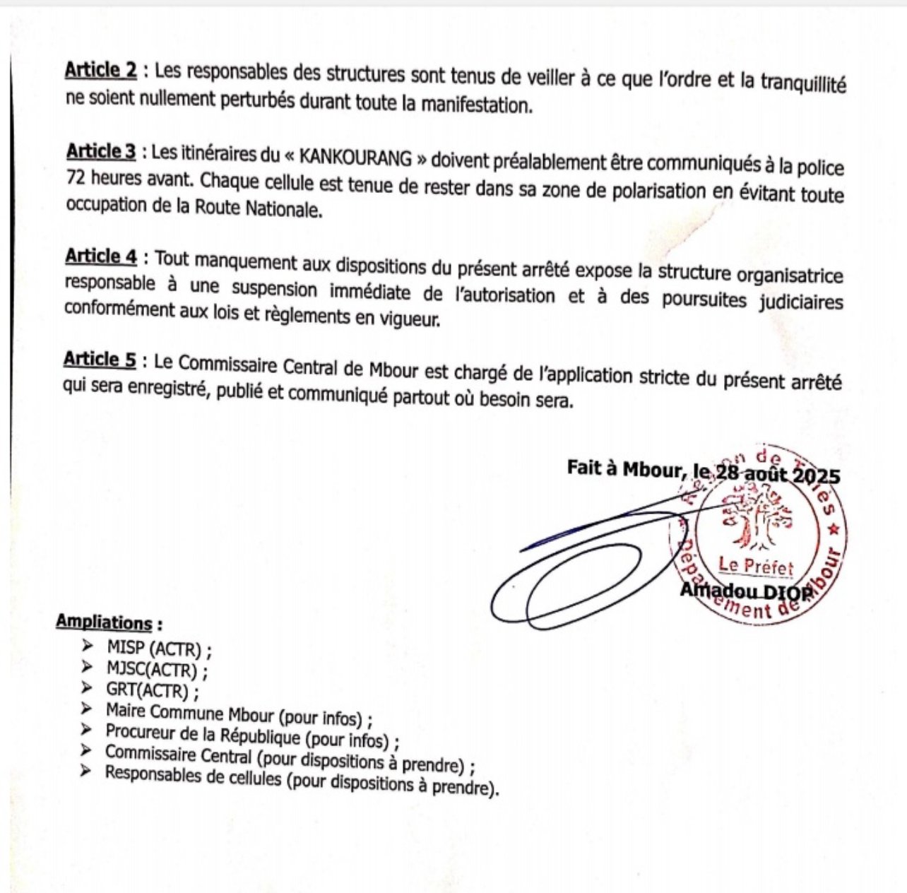 Tout manquement aux règles pourra entraîner la suspension immédiate de l’autorisation et des poursuites judiciaires. Le commissaire central de Mbour est chargé de veiller à la stricte application de ces mesures.