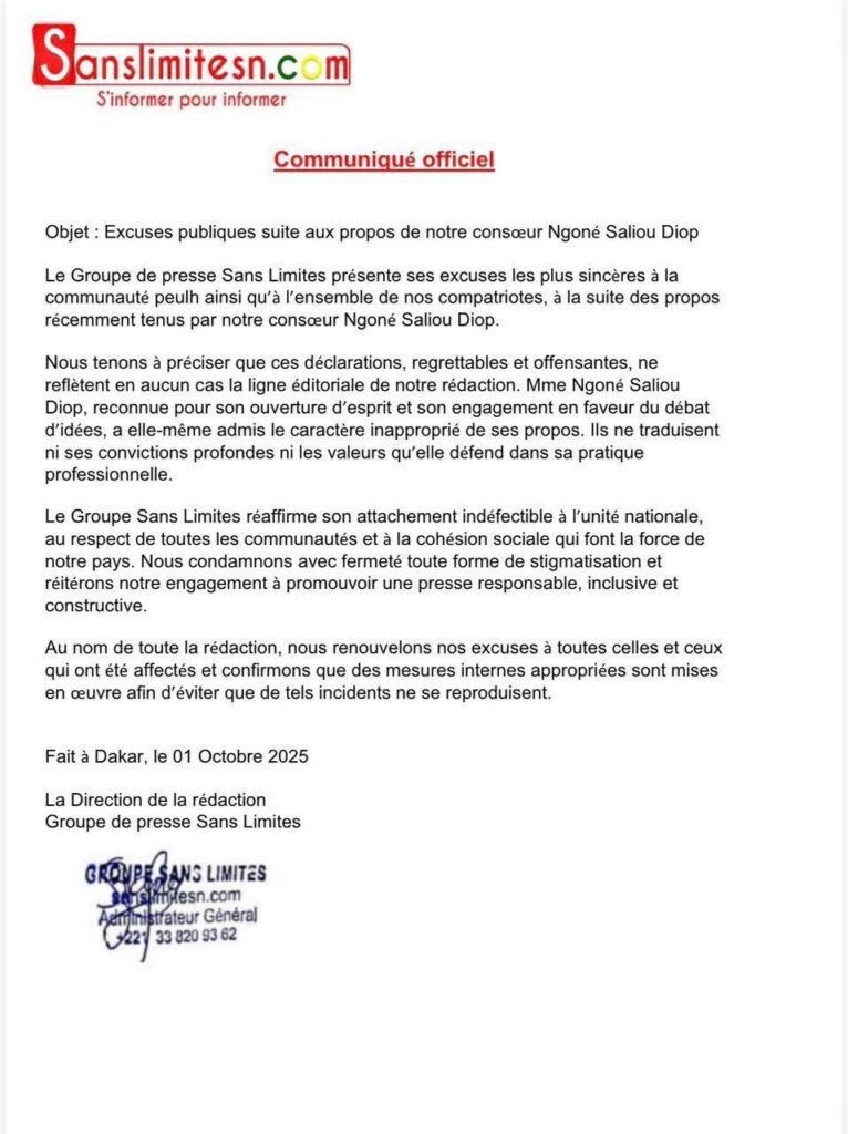 Le Groupe de presse Sans Limites a publié un communiqué officiel pour présenter ses excuses les plus sincères à la communauté peulh et à l’ensemble des Sénégalais, suite à des propos jugés offensants tenus récemment par la journaliste Ngoné Saliou Diop.