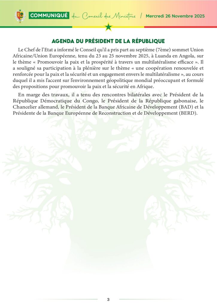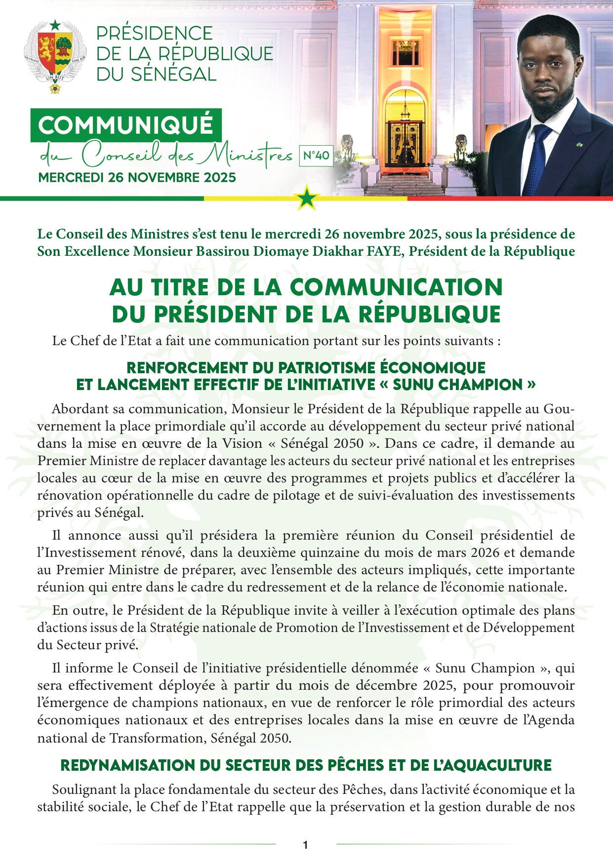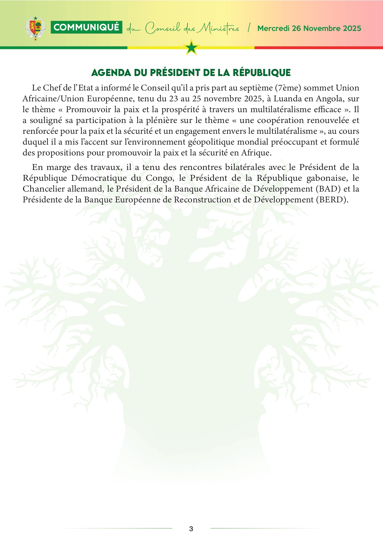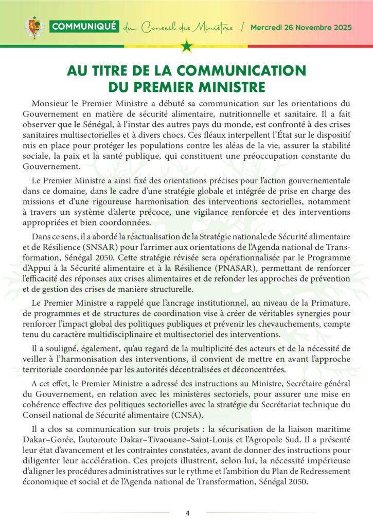 Sénégal : communiqué du Conseil des ministres du mercredi 26 novembre 2025