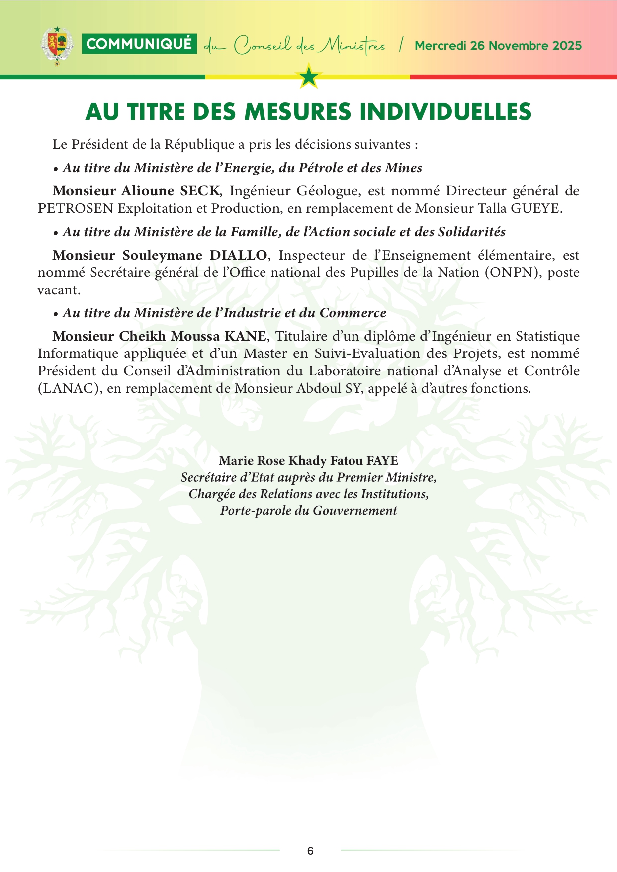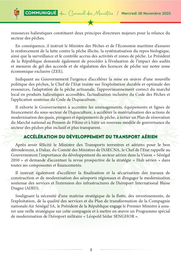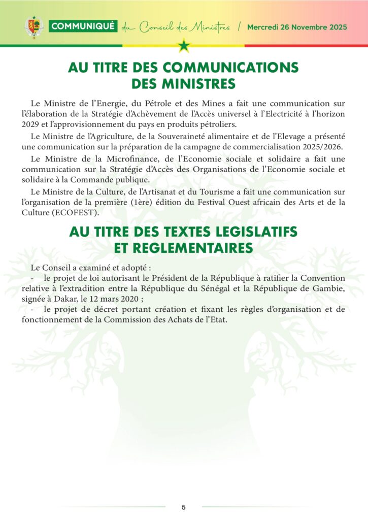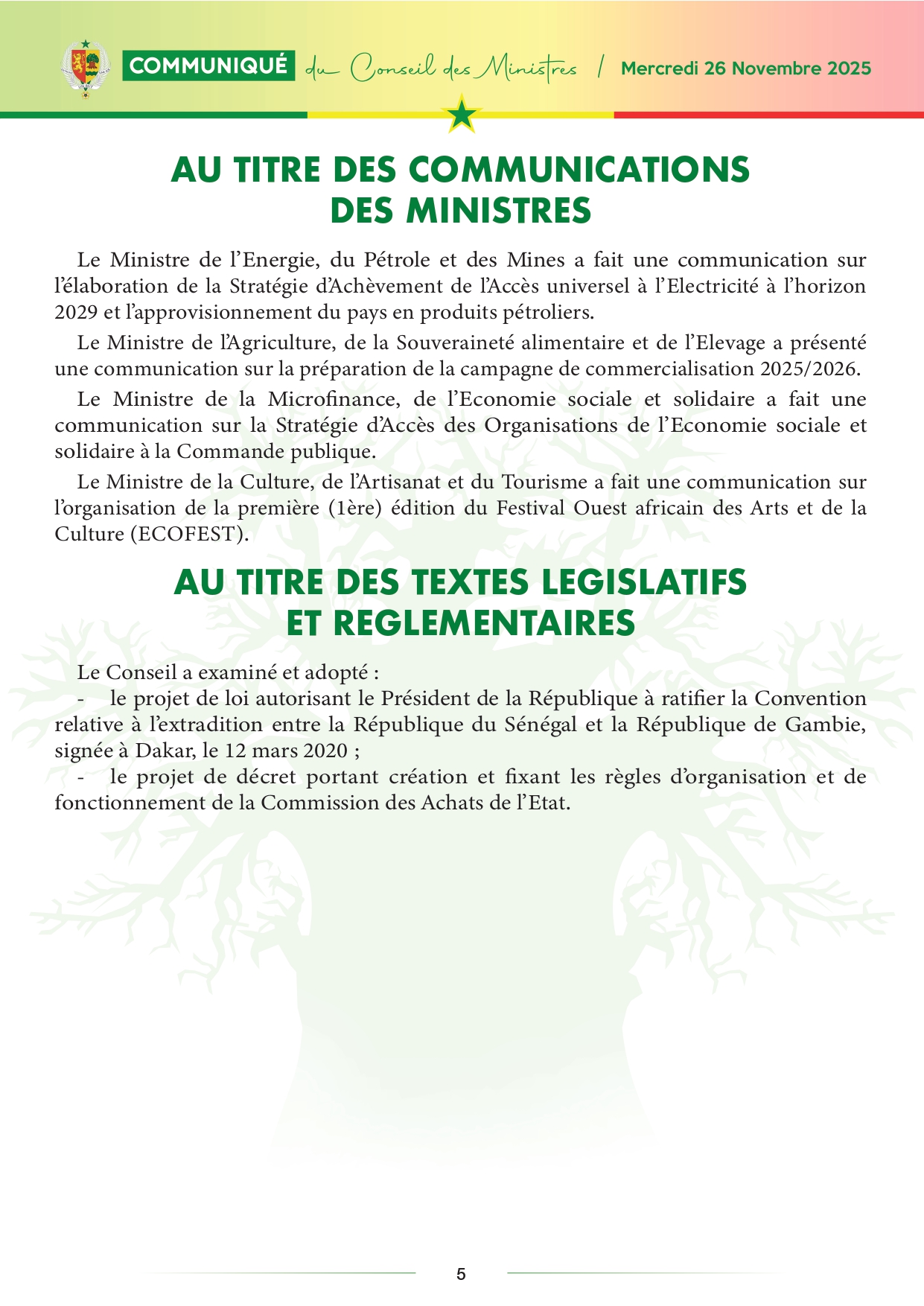Sénégal : communiqué du Conseil des ministres du mercredi 26 novembre 2025