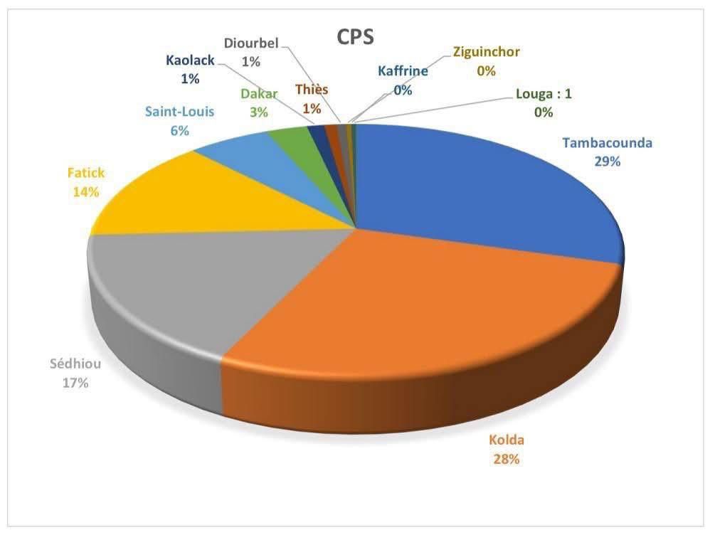 La répartition des 570 CPS est constituée comme suit :Tambacounda 168, Kolda 158, Sédhiou 97, Fatick 77, Saint-Louis 33, Dakar 17, Kaolack 7, Thiès 5, Diourbel 4, Ziguinchor 2, Kaffrine 1, Louga 1.