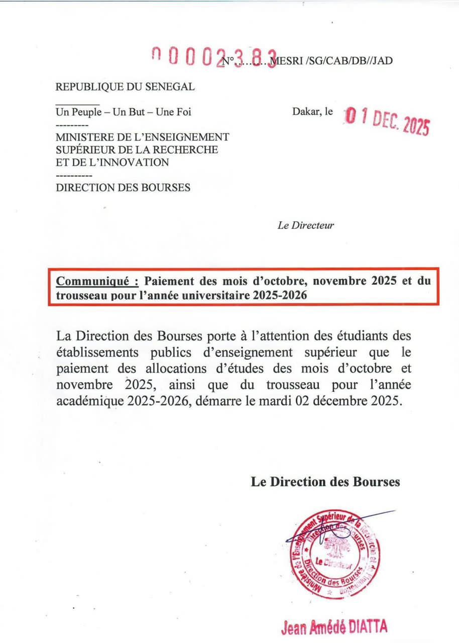 Dans un communiqué signé par son directeur, Jean Amédé Diatta, l’institution invite l’ensemble des étudiants concernés à se rapprocher des services compétents pour procéder au retrait de leurs allocations selon les modalités habituelles.