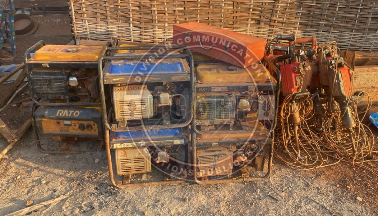 Un important lot de matériel utilisé pour l’exploitation clandestine a été saisi. Il comprend notamment dix groupes électrogènes, dix marteaux-piqueurs, neuf tricycles communément appelés « piki-paka », six motos et sept téléphones portables. Par ailleurs, quatre machines cracheuses ont été détruites sur place, rendant le site totalement inutilisable.