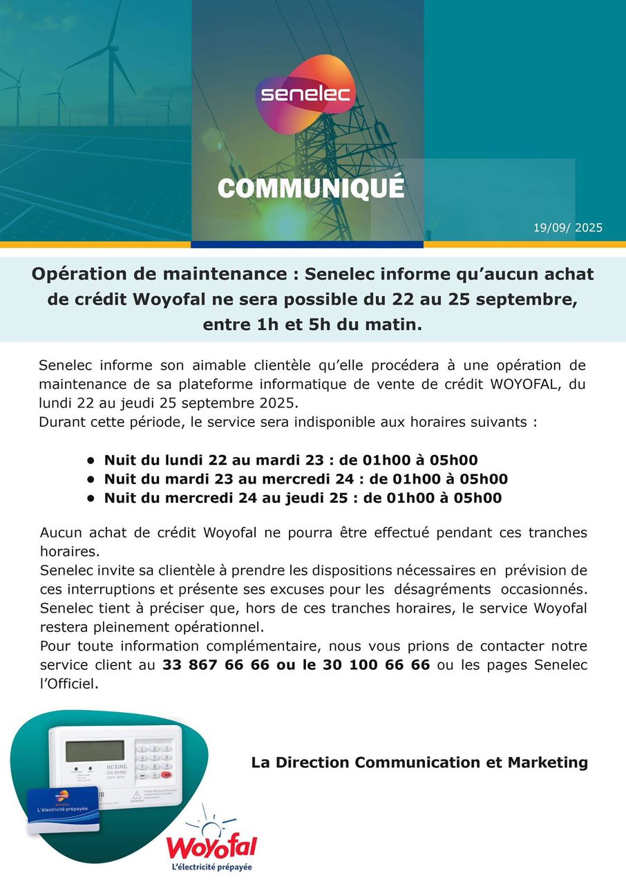 La Senelec a annoncé une opération de maintenance de sa plateforme de vente de crédit Woyofal qui aura lieu du lundi 22 au jeudi 25 septembre 2025. Durant cette période, il sera impossible d’acheter du crédit électrique durant la nuit, entre 1h00 et 5h00 du matin.